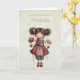 Birthday card with a cute retro image featuring a whimsical girl with rosy cheeks and flowers in her hair. Carrying a green frog doll.