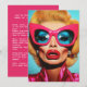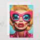 Un retrato llamativo y de alta moda de una diva glamorosa con el voluminoso pelo rubio, gafas de sol de ojos de gato rosado, labios rojos audaces y sombras de ojos azules eléctricos. El aspecto es feroz, retro y sin remordimientos fabuloso, un sueño de arte pop de colores vivos.