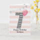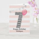 Tarjeta de cumpleaños número 7 con purpurina rosa y plateada para niñas, que se puede personalizar con su nombre. La parte frontal de esta tarjeta de cumpleaños número 7 para ella presenta el número siete en una franja negra y blanca con un contorno de purpurina con un globo rosa listo para flotar. Tenga en cuenta que la purpurina es un efecto de diseño y no habrá purpurina real en esta tarjeta de cumpleaños. El fondo es suave blanco y rosa con un banner dorado en la parte superior. El mensaje interior se puede personalizar fácilmente si lo desea. Una tarjeta de cumpleaños número 7 única para nieta, hija, sobrina, etc.