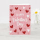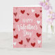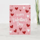 This Valentine's Day card features a soft pink background that gently lightens toward the center, creating a cozy glow behind the main message. In the middle, the words “HAPPY Valentine’s Day” appear in bright white, with “HAPPY” set above in a neat, simple style and “Valentine’s Day” flowing beneath it in a cursive look. Around the text, a scatter of hearts drifts like confetti, mixing solid deep-red shapes with sparkly scarlet ones for a little shine ❤️. You’ll also notice smaller white hearts—some outlined, some filled with sketchy crosshatching—that add a sweet, intimate touch 🥰. Tiny white V marks and small asterisk-like bursts are sprinkled between the hearts, keeping the space lively without feeling crowded. The layout leaves comfortable breathing room so your eyes move easily from the center words out to the floating details. The final touch is a ring of red and white hearts and little white marks spaced loosely around the central lettering.