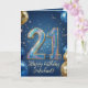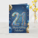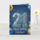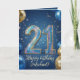 Celebre un importante hito con esta elegante tarjeta de cumpleaños número 21! Este diseño festivo presenta números de purpurina 3D brillantes y deslumbrantes para marcar sus veintiún años, rodeados de globos realistas dorados y azules marino. Contra un fondo mágico de noche estrellada azul, la elegante letra script dorada le permite agregar fácilmente el nombre del cumpleañero. Un diseño sofisticado, moderno y masculino perfecto para la celebración inolvidable de los 21 años de un hijo, hermano, sobrino o amigo.