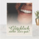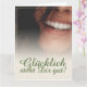 ¡Glücklich steht Dir gut! Kompliment Karte mit lachendem Frauengesicht und handschriftlichen Grüßen auf der Vorderseite der Karte. Restliche Flächen stehen zur freien Verfügung.