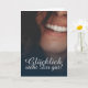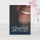 ¡Glücklich steht Dir gut! Kompliment Karte mit lachendem Frauengesicht und handschriftlichen Grüßen auf der Vorderseite der Karte. Restliche Flächen stehen zur freien Verfügung.