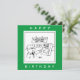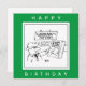 Tarjeta de cumpleaños Gardener. Un hombre de compras en un Garden Center encuentra un "Action Gnome" en el estante. Tarjeta divertida para un jardinero.
