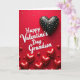 This greeting card features a deep ruby-red background filled with tiny gold starbursts and small sparkly flecks. In the center, the words “Happy Valentine’s Day Grandson” are written in white, flowing cursive-style lettering that stands out clearly against the red. In the upper right, there’s a large black heart covered in neat gold polka dots, giving it a special, eye-catching look. Across the lower half, many red hearts tumble downward in different sizes, some with a soft shimmer and others with a glossy shine. The mix of shiny and softer textures makes the hearts feel layered and full of warmth. It feels meaningful to give because it’s direct about who it’s for, and the hearts and gold details add a gentle feeling of love and care ❤️.