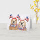 Esta tarjeta del 4 de julio presenta a los recuperadores dorados con corbatas de arco patriótico y bandas de cabeza con banderas estadounidenses. El texto dice: "¡Dejen volar sus banderas! ¡Que tengan un cuarto feliz!".