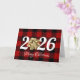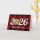 Arco de regalo de oro sobre fondo rojo y negro de chapa búfala para la Feliz Navidad 2025.