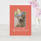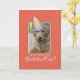 ¡Un perro recuperador de oro está lamiendo sus labios listos para disfrutar esa tarta de cumpleaños! Lleva puesto un gorra fiesta, esperando pacientemente. El entorno naranja aporta un toque de alegría.