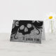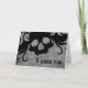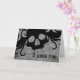 Una tarjeta genial de ausencia con una calavera con colmillos Victoriana Gótica en negro sobre un fondo gris. Personaliza con tu propio texto si lo deseas en una fuente medieval gótica genial.
