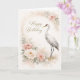 A serene and refined birthday design featuring a graceful white crane standing amid soft blush peonies and airy greenery. Delicate watercolor textures, muted pastels, and subtle gold accents create a calm, elegant atmosphere. The flowing “Happy Birthday” script complements the composition, making this artwork ideal for sophisticated tastes, nature lovers, or anyone who appreciates timeless beauty and quiet charm.