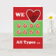 "Corazón" de todo tipo... y te queremos. Gracias por ser donante de sangre, tarjeta de felicitación de papel. Color rojo, verde y blanco con gotas y tipos de sangre con un corazón grande con latido en el interior. Tarjeta audaz y colorida para celebrar y agradecer a un donante de sangre. Derechos reservados © Shoaff Ballanger Studios.