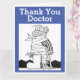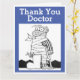 Gracias, Médica, tarjeta personalizado graciosa. Crea tu propio mensaje interno. Tarjeta para enviar a un médica o cirujano, Man in pijama tiene una pierna rota y está envuelto en vendas y en muletas. Fondo azul.