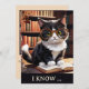Tarjeta de cumpleaños con un lindo gatito con gafas en una biblioteca o habitación con muchos libros. En la parte de atrás hay un diseño similar con una tira de pata de gato adorable. Hermoso por el tardío cumpleaños de un amante del gato y personalizable para otras situaciones.