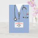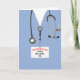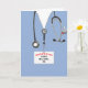 Diseño de tarjetas de graduación de escuelas de medicina para cualquier médica, con exfoliaciones hospitalarias y un cuchillo del ejército suizo en el bolsillo. Editar texto para agregar el nombre del médico.