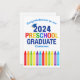 Esta adorable tarjeta de graduación preescolar 2024 incluye un fresco tapón de pasto encima de la colorida escritura y una hilera de lápices de colores en arco iris. Cute personalizable Pre-K tarjeta de felicitaciones de graduación en colores divertidos para tu preescolar con el nombre de tu hijo personalizado en azul. ¡Felicitaciones a nuestro pregrado!