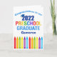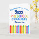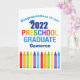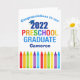 Esta adorable tarjeta de graduación preescolar 2022 incluye un fresco tapón de pasto encima de la escritura colorida y una hilera de lápices de colores en arco iris. Cute tarjeta de felicitaciones de preescolar en colores divertidos para el último día de la escuela primaria con el nombre de tu hijo personalizado en azul. ¡Felicitaciones a nuestro pregrado!