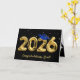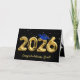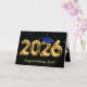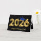 Gold foil balloons for 2026 graduation on a black background with a blue cap and gold confetti.