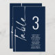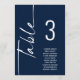 Gráfica de asientos con nombres de número de tabla blanca de la marina de guiones. Edite su número para cada tabla y añada a su carrito por separado. El mismo diseño se encuentra en ambos lados, y se puede utilizar para ver el colgante, para que los clientes puedan encontrar su asiento o en cada mesa. En azul marino clásico con escritura blanca. Personalice fácilmente el número de tabla y los nombres de invitados. El mismo diseño está en ambos lados y se actualizará simultáneamente a medida que cambies las palabras a las suyas.