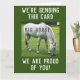 ¡Tarjeta de felicitación con un divertido mensaje de caballo! Estamos mandando esta tarjeta a caballo grande (porque) estamos orgullosos de ti. La imagen es una fotografía de un caballo blanco pastoreando en un campo.