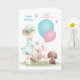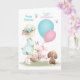 Tarjeta de feliz cumpleaños para una joven Gran Nieta que presenta una niña dulce que lleva una canasta llena de flores con dos globos, acompañada por su adorable cachorro marrón y sus mariposas azules.