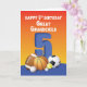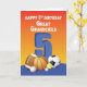 En el frente de esta carta hay un baloncesto, una pelota de fútbol, un fútbol y tres pelotas más pequeñas alrededor del gran número 5. Una tarjeta que fue diseñada para enviar felices saludos de cumpleaños a su adorada bisnieta que estarán celebrando.
