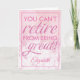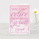Una sorprendente tarjeta de retiro personalizada. Este hermoso diseño de tipografía sería perfecto como una tarjeta de retiro de la oficina para una enfermera, abogado o profesor. La cita "No puedes retirarte de ser genial" aparece en la tipografía rosa sobre un fondo de burbuja rosa pálido. Agregue su propio mensaje y nombre de destinatario para hacer una tarjeta de felicitaciones verdaderamente única y personal.