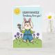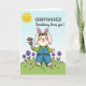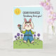 This card shows a sweet rabbit-like character standing front and center on a grassy hill, offering a small bouquet as if sharing a gentle crush or close friendship 🐰. The character has soft cream fur, pink inner ears, and rosy cheeks, with a tiny flower crown resting between its ears. It wears blue overalls layered over a bright green top, and its paws curl carefully around a multicolored bunch of blossoms. Around the hill, purple tulip-shaped flowers rise up, each with a simple smiling face that echoes the bunny’s friendly expression 🌷. Above the scene, the sky fades from pale to light blue, and a round sun with a smiling face sits high overhead. The text sits near the top of the card, with “GRANDDAUGHTER” in large uppercase letters and “Somebuny loves you!” placed just below it in a lighter, hand-lettered style. Soft outlines define the meadow, the bunny’s overalls, and the tulip petals, with small blades of grass drawn one by one across the knoll.