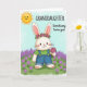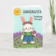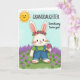 Designed with a sweet spring scene, this card features an upright, humanlike cream-colored bunny with rosy cheeks and tall ears lined in pink 🐰. A ring of bright pink blossoms sits on its head, and it wears blue overalls over a soft green shirt while holding a small bouquet of fuchsia flowers close to its chest, as if offering it to someone special. The bunny’s gentle smile and slightly tilted head give it a tender, affectionate look that suggests closeness and care. Across the top, the word “GRANDDAUGHTER” appears in large, dark lettering, and near the upper right the phrase “Somebunny loves you!” is written in smaller, flowing dark text. The background shows fresh green grass sprinkled with pastel purple and lavender blooms, with taller purple plants rising behind like a garden border 🌷. A light blue sky stretches overhead, and in the upper left a smiling sun icon beams down with short rays. Soft watercolor-style shading gives the flowers and fur a light, airy finish, and the bouquet’s pink tones echo the floral crown.