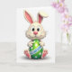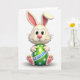 This card features a creamy white bunny character centered on a bright white background, with glossy dark eyes and a small smile that feels like a friendly, affectionate greeting 🐰. One ear stands up while the other bends over, giving the little figure a gentle, bashful look. Soft pink shows inside the ears and on the paw pads as it hugs a smooth green egg close to its chest, like it’s offering a sweet gift to someone special 🐇. The egg has neat white polka dots and a light blue ribbon wrapped around the middle. Across the ribbon, the word “GRANDSON” appears in tidy capital letters, standing out clearly against the blue band. The lighting is soft and even, with faint shadows under the bunny and around the egg that add depth without darkening the scene. Fine whiskers extend from a small pink nose, and glossy highlights shimmer along the egg’s curved surface. The background stays plain and bright, making the green egg, blue ribbon, and white dots the main color accents.