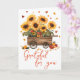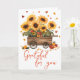 Send a heartfelt note of thanks with this charming card featuring a rustic wooden cart overflowing with sunflowers, pumpkins, and autumn produce. Scattered leaves and warm-toned hearts add a cozy touch, while the “Grateful for you” message makes it perfect for expressing appreciation. The inside is blank—ready for your own personal sentiment.