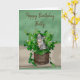 Tarjeta de cumpleaños personalizada para los amantes de los gatos. Un gatito grisáceo lindo sentado en un cubo de plantas.