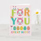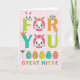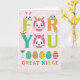 This design shows a festive scene on a soft, textured pale pink background, centered around the message “FOR YOU GREAT NIECE” in thick, outlined letters filled with different bright colors. The words sit in the middle of the card, with the text stacked and spaced so it feels like a cheerful banner. Cute rabbit faces 🐰🐇 peek from inside and on top of a few letters, their rosy cheeks and wide eyes giving the group a tender, friendly look as if they’re leaning in close together. One bunny wears a tiny golden crown, adding a sweet little “guest of honor” touch to the lettering. Small rounded creatures in aqua and yellow perch on the letters too, like tiny companions sharing the spotlight. Beneath the message, five decorated oval egg shapes line up in a neat row, each patterned with dots, zigzags, or stripes in varied colors. To the left of the eggs sits a simple goblet-like icon with a red interior, and the eggs are edged with light outlines against the pink backdrop.