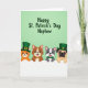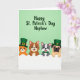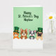 This card shows four cartoon-style animal friends peeking over a white horizontal line against a soft green gradient background, giving the scene a cozy, friendly feel 💚. An orange cat, a brown dog, a gray-and-white spotted dog, and a fawn-colored short-nosed dog lean in close together, their wide smiles and shiny dark eyes suggesting an easy bond like close friends sharing a joke. The orange cat and the short-nosed dog wear emerald green top hats with small golden buckles, adding a festive touch without overpowering the characters. The spotted dog has a green bow tie, and the brown dog wears a small gold clover charm that reads like a thoughtful little gift between pals ☘️. Across the upper area, the message “Happy St. Patrick’s Day Nephew” appears in rounded letters, set in a darker green that stands out clearly from the lighter background. The text sits centered near the top, leaving plenty of space for the characters’ faces and hats to draw the eye. Smooth shading and simple outlines keep the focus on their expressions and the way they cluster together like a group photo. The green bow tie, gold clover charm, and hat buckles add small highlights above the crisp white line at the bottom.