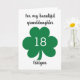 Una tarjeta personalizada de 18 años del Día de San Patricio con una hoja de trébol en la parte delantera. Podrá personalizar fácilmente el frente con los detalles del destinatario de cumpleaños. El mensaje de la tarjeta interior también se puede personalizar. Esta tarjeta de cumpleaños personalizada del Día de San Patricio le haría un gran placer para ella.