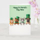 This card shows four cozy animal friends—two cats and two dogs—peeking over a bright white ledge against a pale green background, their heads close together like they’re sharing a private joke 💚. A ginger kitten wears a small green hat, while a fluffy brown dog and a wrinkled-faced dog wear taller green hats with tiny gold buckle details, and a grey-and-white tabby stays bare-headed for contrast. Green bow ties on the brown dog and the grey-and-white tabby add a sweet touch, as if they dressed up to match for someone special ☘️. Their expressions tell the story: the kitten looks wide-eyed and curious, the brown dog grins with an open mouth, the tabby gazes calmly with blue eyes, and the wrinkled-faced dog looks quietly watchful. The gentle lighting softens their fur and makes the greens feel fresh without being harsh. Centered above the group, dark green text reads “Happy St. Patrick’s Day, Nana,” sitting neatly in the open space of the background. The letters are smooth and slightly slanted, floating above the four faces like a header. The pale green backdrop stays uncluttered, with the white ledge forming a straight horizontal line beneath their chins.