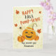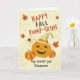 Feliz otoño. Una linterna Jack o' con una sonrisa linda y un gorra de brujas decora la portada de esta tarjeta de saludo de Halloween para un amigo secreto. Personalizar el texto inferior de la cubierta según sea necesario. Arte, imagen y verso copyright © Shoaff Ballanger Studios, 2022.