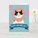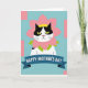 This card features a stylized two-tone cat centered on the front, with a white body and sharp black markings across its head and pointed ears. A large, soft pink flower crown with fresh green leaves circles its face, adding a sweet, affectionate touch that contrasts with the cat’s unimpressed look. The narrowed yellow eyes and slight frown give it a dry, funny charm, like it’s accepting the attention with quiet loyalty rather than gushing emotion ❤️. The background is a calm light blue, keeping the scene airy and open. Near the top corners, small pink rectangles add simple accents without pulling focus from the character. Along the bottom, a deep blue banner stretches across the width, and the words “HAPPY MOTHER’S DAY” appear in white, all-cap letters centered on the banner 🌼. The pink crown sits high around the cat’s head, with rounded petals layered over one another and green leaves peeking out between the blooms.