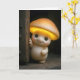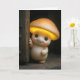 Una criatura linda y sonriente con una gorra de setas resplandeciente está mirando desde detrás de una rústica puerta de madera. El texto interior es editable.