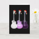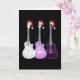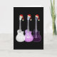 Tarjeta de felicitaciones navideñas de guitarras eléctricas de Navidad con sombreros de Santa morados. Una excelente tarjeta de Navidad de arte pop psicodélico para guitarristas, músicos y amantes de la música, especialmente para chicas adolescentes. Dibujos de arte psicodélico de tres guitarras en obra original etérea y translúcida de color morado por la artista Catherine Sweetman