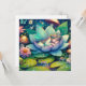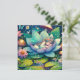 Pequeño hada adorable que duerme sobre una flor de loto en una almohadilla de lirio con flores y fondo de setas. Ilustracion de estilo cuento de hadas. Tarjeta en blanco.