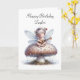 Tarjeta de Cumpleaños Personalizada con un lindo hada sentada encima de un hongo con gotas de lluvia tocando el ukulele.
