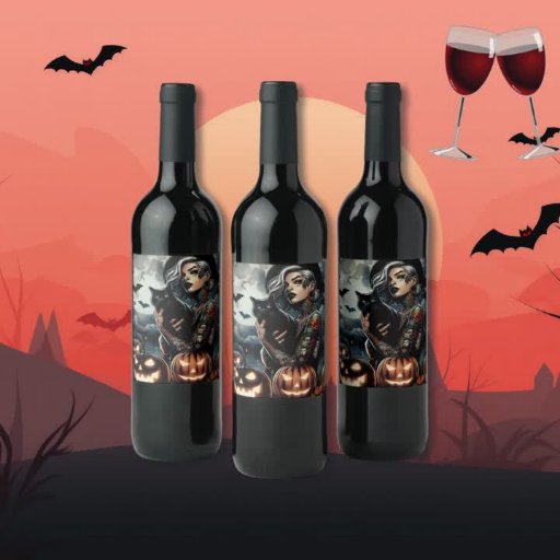 Tarjeta de Halloween con temática de bruja. Espeluznante bruja gótica tatuada con un gato negro, murciélagos y gráficos de luna llena.