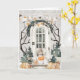 Esta divertida tarjeta temática de Halloween incluye una corbata sentada en el corredor con un truco o una calabaza en su boca. El porche está decorado para Halloween con calabazas y una pancarta negra y naranja. En el interior aparece un texto que dice "primero hago trucos, luego recibo trucos". Puede personalizar con un nombre.