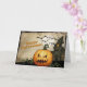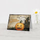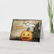 Halloween Card de Halloween con la casa de los haunted y Jack o' Lantern. ¡Una tarjeta de vacaciones de Halloween realmente fresca con una casa cazada en la ladera de una colina, un atrevido gato de linterna y una gran luna con murciélagos volando sobre sus cabezas!