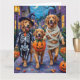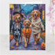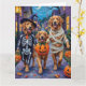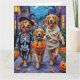 Adorables Golden Retrievers vestidos con juguetones disfraces de Halloween llevan cubos de calabaza mientras truco o truco bajo el cielo iluminado por la luna. Este diseño festivo resalta el caucho dorado, los ojos amables y la personalidad amorosa de la raza, capturando a la perfección la atmósfera espeluznante y divertida de la noche de Halloween. Una alegre celebración para los amantes del perro y los fans de Halloween por igual.