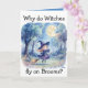 Haz que los pequeños ghouls y los goblins giren esta espeluznante temporada con la tarjeta de saludo de los niños de Halloween que incluye a una encantadora bruja que está llena de encanto! En la cubierta, una personalizado desenfadada baila con su escoba en un bosque mágico bajo una luna brillante, con la divertida pregunta: "¿Por qué vuelan las brujas sobre las escobas?" En el interior, el cartel espera: "Porque... ¡los acuarios son demasiado pesados! ¡Feliz Halloween!" Un caprichoso ilustracion de escoba sobre un fondo azul coordinador lo une todo para una carta que es dulce, tonta y segura que trae sonrisas. Perfecto para niños, compañeros de clase, trucos o tratantes, o para cualquiera que ame un buen chiste de Halloween.