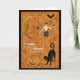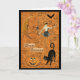 Tarjeta de Halloween con luna temible, murciélago, mujer disfrazada, calabaza y gato negro y texto viejo en segundo plano