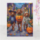 Adorables Setters Rojos Irlandeses vestidos con juguetones disfraces de Halloween llevan cubos de calabaza mientras truco o truco bajo el cielo iluminado por la luna. Este diseño festivo resalta el caucho rojo de la raza, su elegante construcción y su animada personalidad, capturando a la perfección la atmósfera espeluznante y divertida de la noche de Halloween. Una alentadora celebración para los amantes del perro y los hinchas de Halloween por igual.