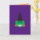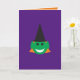 ¡Esta tarjeta de diversión es la manera perfecta de desear a cualquiera una feliz Halloween! La tarjeta púrpura tiene una linda cara de bruja verde al estilo personalizado, con un gorra negro puntiagudo, orejas puntiagudas, pelo naranja y una expresión sonriente feliz. El interior de la tarjeta es naranja, con el mensaje "¡FELIZ HALLOWEEN!" en letras violetas. ¡Ideal para fiestas de Halloween u otros eventos, o para todo el mes de octubre!