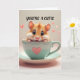 This image features an irresistibly cute, fluffy hamster peeking out from a light mint green teacup, which has a pink heart on its side. The hamster has large, shiny dark eyes, rosy cheeks, and tiny pink paws, with a happy, curious expression. Small pink hearts float around the teacup against a soft, light pink background, enhancing the sweet and adorable theme.